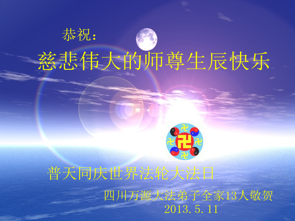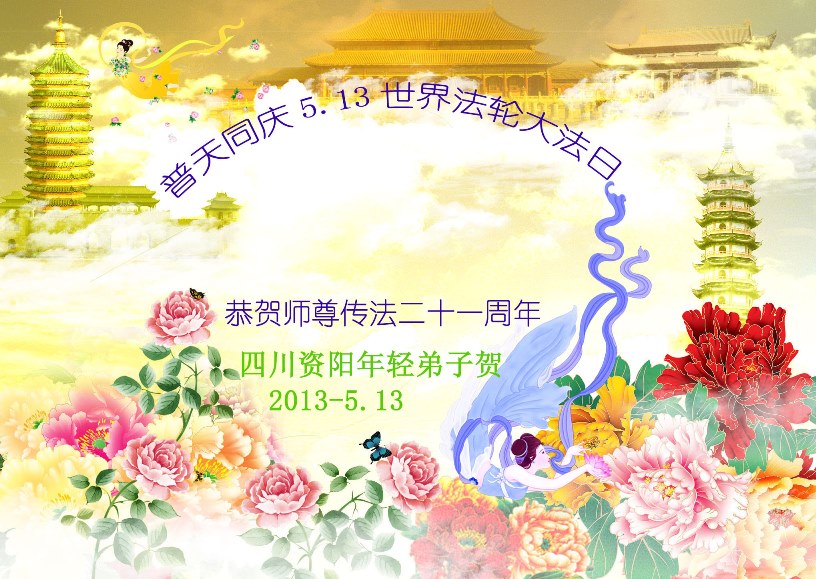 在5.13这个感恩的节日,在此普天同庆的日子里,河北邢台柏乡大法弟子遥祝慈悲伟大的师尊生日快乐!暨法轮大法洪传二十一周年二零一三五月十一日 四川资阳市大法弟子恭祝师尊生日快乐!共庆世界法轮大法日!
