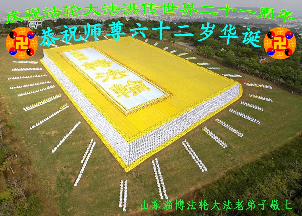 山东淄博法轮大法弟子庆祝法轮大法洪传世界二十一周年!恭祝师尊六十二岁华诞!