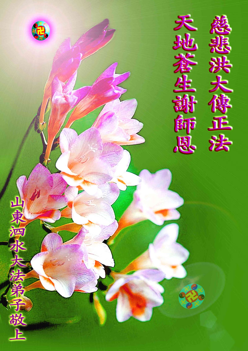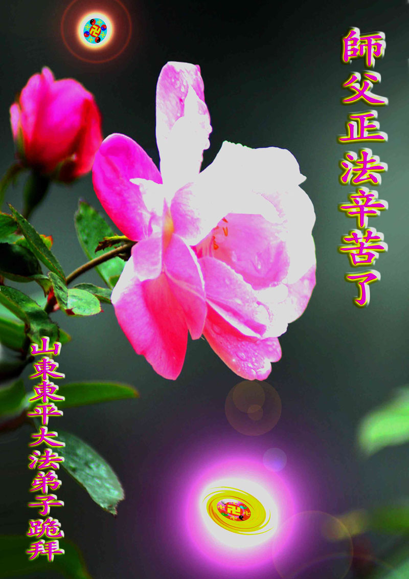 弟子感恩师尊慈悲救度!在这些年的正法修炼中,弟子一步步走向成熟,每一步都离不开师尊的慈悲呵护和巨大承受,而师尊替弟子承受的弟子也许永远也不会知道的。弟子知道自己所做的离师尊的要求还相差很远,在最后有限的时间里,弟子一定更加勇猛精進,修好自己,多救众生,做一个合格的大法弟子,不给自己将来留下遗憾,圆满的跟师父回家。跪拜师尊!合十! 山东邹平大法弟子恭祝师尊生日快乐!恭贺世界法轮大法日!