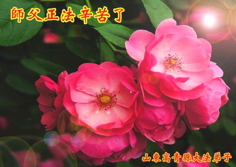 师父您好!师父辛苦了!在最后的宝贵时刻,弟子一定更加精進,与其他同修互相配合,互相补充,共同提高,完成救度众生的神圣使命,恭迎法正人间的辉煌时刻!弟子跪谢师尊救度洪恩!合十! 山东桓台大法弟子恭贺师尊华诞暨世界法轮大法日!