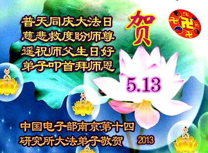 普天同庆大法日 慈悲救度盼师尊 遥祝师父生日好 弟子叩首拜师恩 中国电子部南京第十四研究所全体大法弟子敬贺 江苏省全体大法弟子同庆世界大法日!