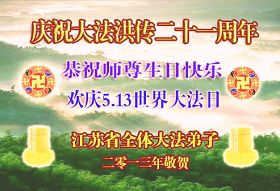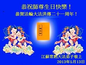 恭祝师父生日快乐!普天同庆法轮大法洪传二十一周年! 常州大法弟子敬上 2013.5.13 江苏省南京大法弟子学法小组全体大法弟子祝师尊生日快乐!