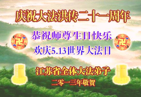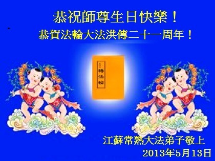 恭祝师尊生日快乐! 恭贺法轮大法洪传二十一周年! 大法洪传二十一 幸得大法是前缘 炼功学法修心性 讲清真相救众生 师尊铺好回天路 弟子精進不停步 了结宏愿兑誓约 江苏江苏省苏州市常熟市大法弟子敬上 2013年4月25日 江苏省南京大法弟子祝贺5月13日法轮大法日!