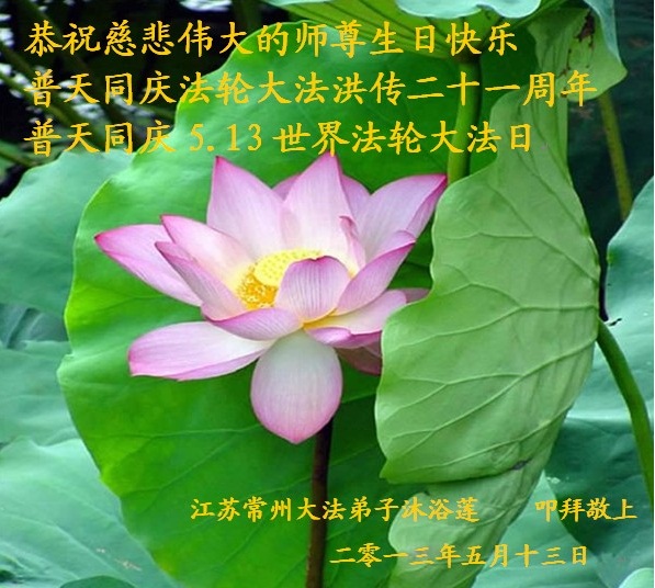 恭祝慈悲伟大的师尊生日快乐!普天同庆法轮大法洪传二十一周年!普天同庆5.13世界法轮大法日!江苏常州大法弟子沐浴莲 叩拜敬上 二零一三年五月十三日 恭祝师尊生日快乐
