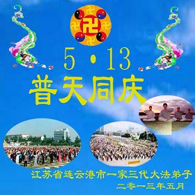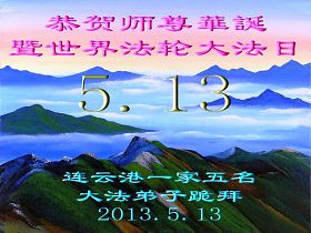 感谢师尊救度之恩!在这仅有的时间里,弟子们只有精進再精進,兑现誓约,以报师恩! 连云港一家五名大法弟子跪拜 2013.5.13 江苏省连云港两名老年大法弟子恭祝师尊华诞暨法轮大法日!