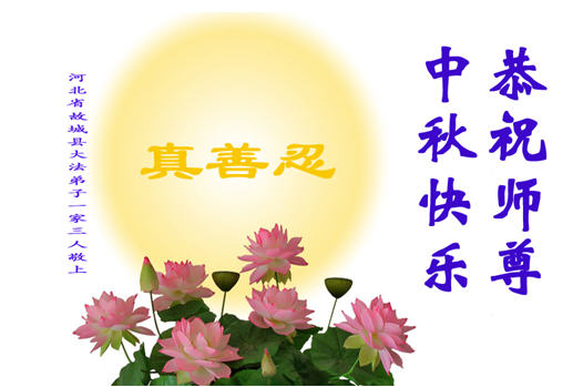 河北省衡水市故城县大法弟子一家三人恭祝慈悲伟大的师尊中秋节快乐!
