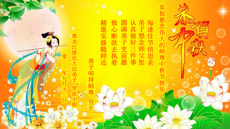 每逢佳节倍思亲,在2013年中秋节即将到来之际,弟子最最想念的是师父。师尊正法十几年,在伟大师尊无量慈悲为弟子及一切众生一再延续的时间里,弟子深知师尊又为所有众生增加多大份量的承受与付出,弟子无法想象。师尊把一切最好的都给了弟子,弟子唯愿师尊能欣慰。请师尊放心,阿城全体大法弟子,在最后正法所剩不多的时间里,一定不负师望,珍惜每分每秒,我们一定努力做到师尊教诲的“修炼如初”;“越最后越精進”;我们一定做到越加坚定精進实修,多救人、快救人。兑现自己的誓约,最后能圆满随师还!叩谢师尊为宇宙所有众生的巨大无比付出!师尊:您辛苦了!合十! 河南省周口地区项城市一学法小组祝慈悲伟大的师尊中秋节快乐!