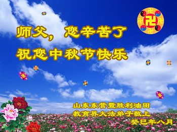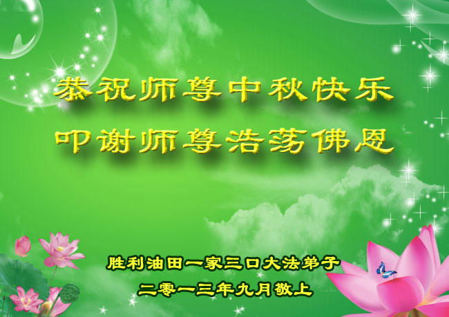 认真做好三件事, 广救世人不图报。 谢谢师尊解大难, 坚信大法不动摇, 佛恩浩荡永不忘, 普天同庆传喜报。 山东东营市暨胜利油田教育界大法弟子恭祝师尊中秋快乐!