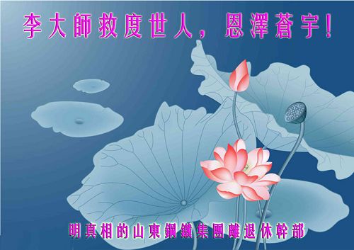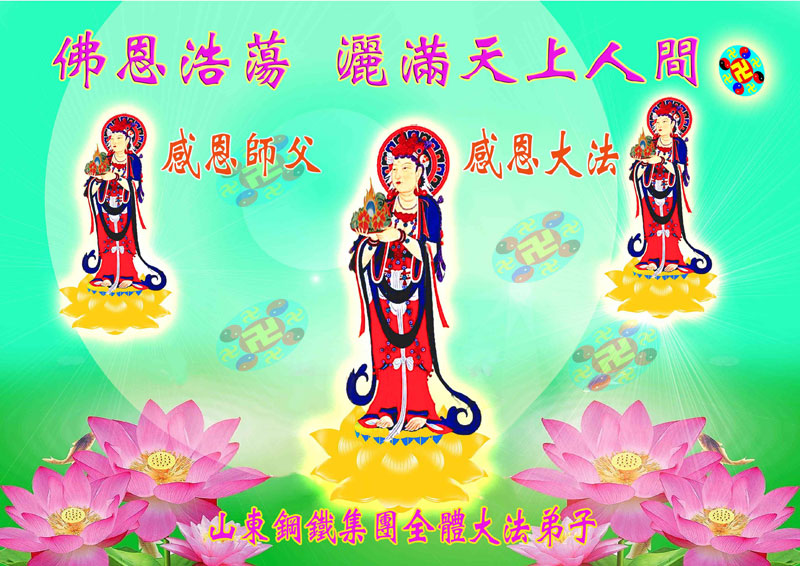我们感恩师李大师对我们的慈悲救度!我们从法轮大法修炼者的身上看到了法轮大法的神奇和美好,他们遵照李大师的教导善待着周围的每一个人,不厌其烦的给我们讲着真相,使我们不致错失亘古以来未曾有的美好机缘。敬请李大师放心,我们也会把法轮大法的福音传递给身边的每一个人,使他们有美好的未来。叩谢李大师慈悲救度! 山东钢铁集团全体大法弟子恭祝师尊中秋快乐!