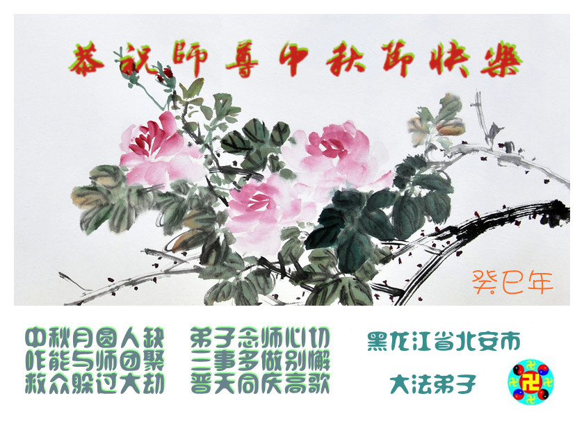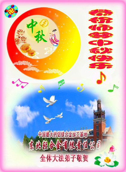 中秋节感恩 八月中秋,风清月明盼团圆,最深切的思念,是对师父的感恩感念,感恩的心象一只只归燕,衔着一张张精美的贺卡,飞向师父……感恩师父慈悲苦度,感恩师父呵护弟子走过乱世里的一年又一年,师父辛苦了!敬祝师父中秋节快乐! 哈尔滨市平房区全体大法弟子敬贺!2013年中秋节 黑龙江省哈尔滨东北轻合金有限责任公司全体大法弟子恭祝师尊中秋快乐!