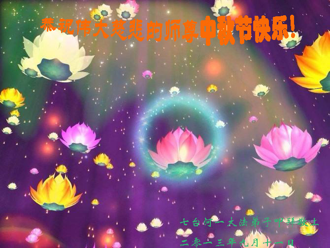 【明慧网二零一三年九月十八日】 黑龙江七台河六人学法小组大法弟子祝师尊中秋节快乐!