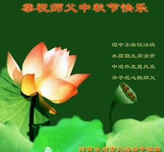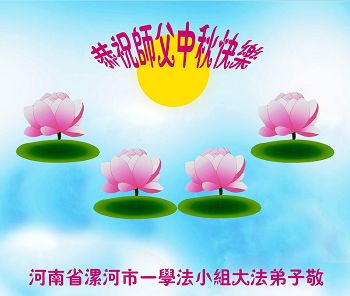 漯河市全体大法弟子们想念您!叩拜师父!正值金秋送爽、佳节来临之际,我们再一次用小小的贺卡寄语思念。我们虽然从未见过师面,但我们感觉师父时时在我们身边。请师父放心,我们会学好法,修好自己,多救众生,做好三件事。 河南省漯河市一学法小组大法弟子恭祝慈悲伟大的师父中秋节快乐!