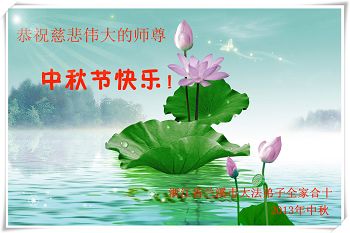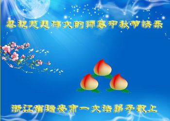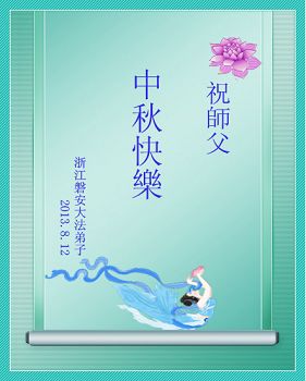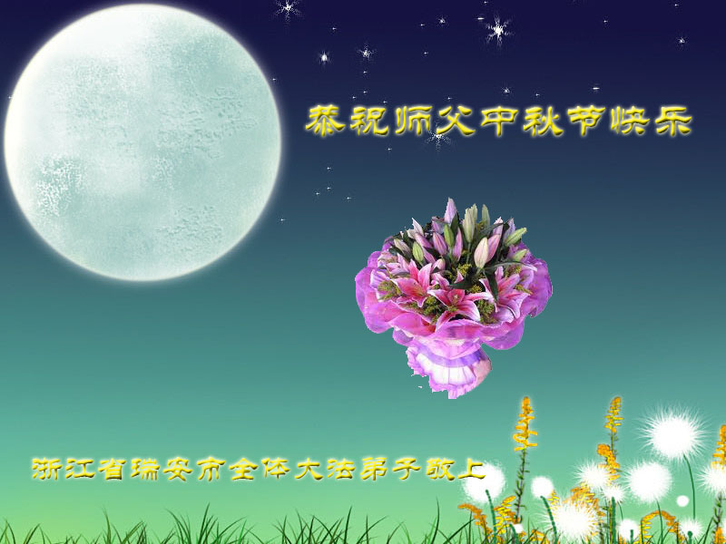 师尊您好!您辛苦了!又是一个中秋佳节,弟子们非常想念您!借此中秋佳节之际,深深的表达弟子们对师尊的无比感激之情!在以后有限的时间里,我们要更加不断精進实修,共同配合形成强大的整体,真正的在法上提高,做好大法弟子该做的三件事,跟上师尊的正法進程,让师尊多一份欣慰,少一份操劳。弟子们在此叩拜师尊! 浙江省温州瑞安市一大法弟子恭祝慈悲伟大的师尊中秋节快乐!