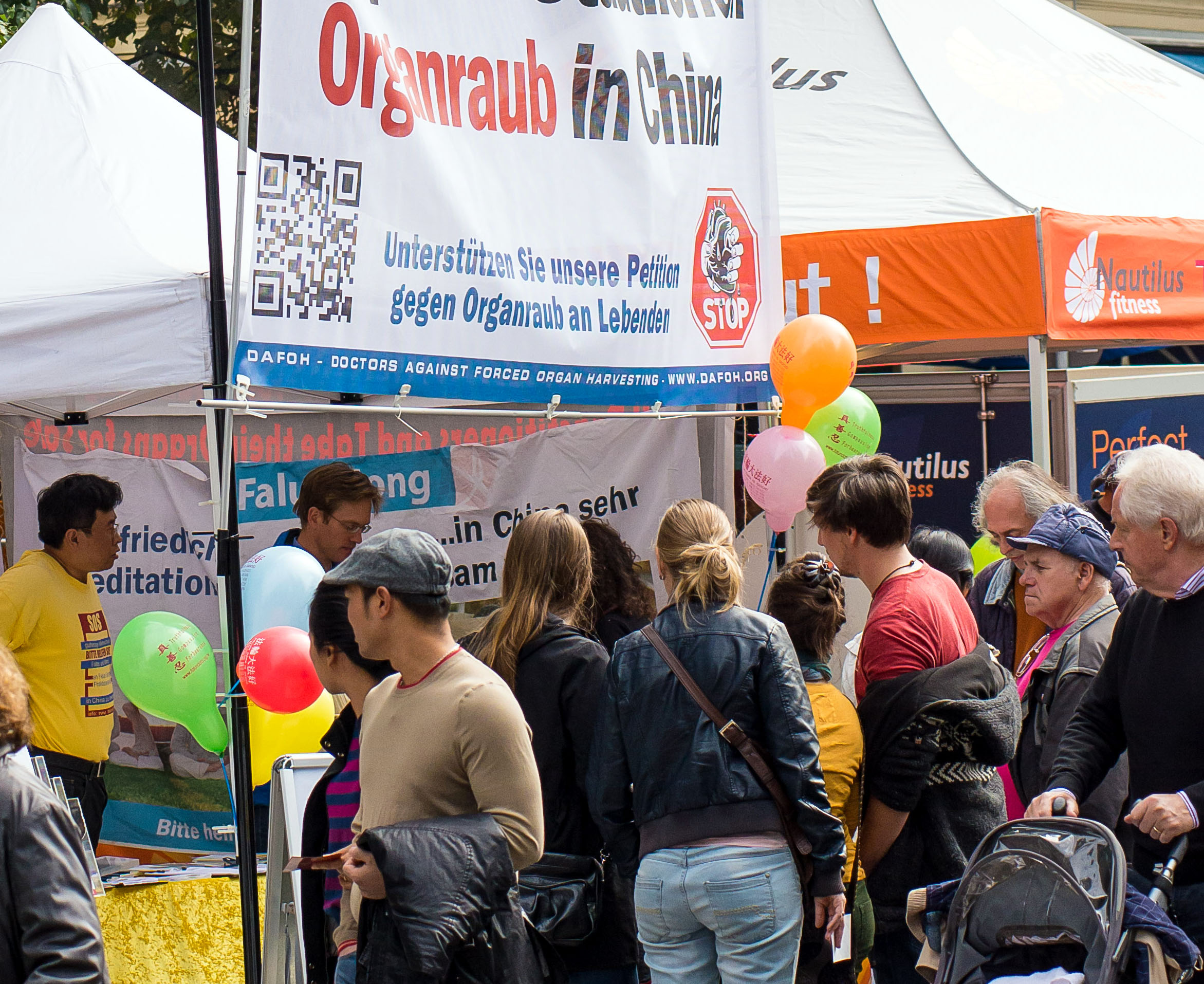 【明慧网二零一三年九月十八日】(明慧记者德祥德国慕尼黑报道)“这种事情就是要大面积的揭露出来,让更多的人知道。”在德国城市节上,一位慕尼黑大学退休心理学教授对法轮功学员说。 德国法轮功学员在慕尼黑街头艺术节上揭露中共活摘器官的罪行。 |