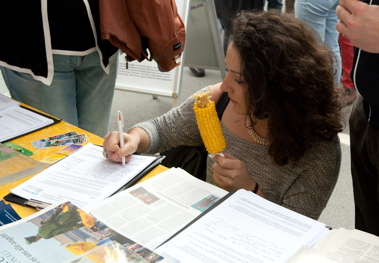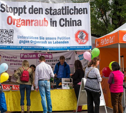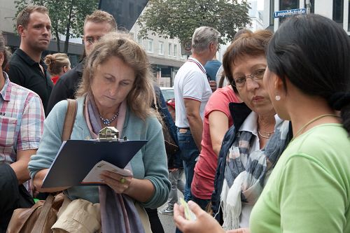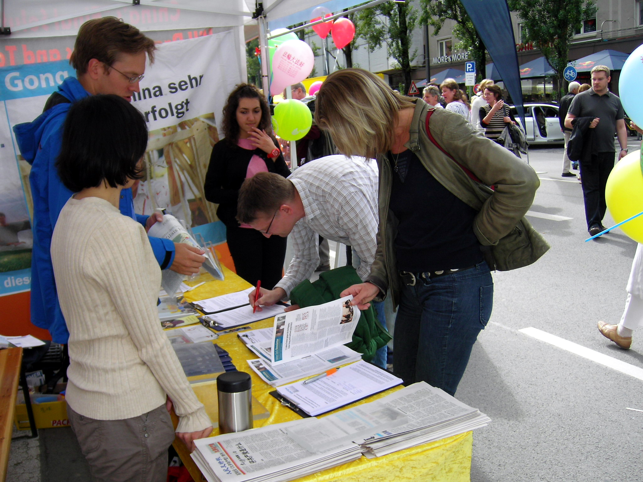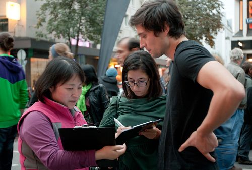 “我是天主教徒,看到这种事情(或提摘取法轮功学员器官)绝对要签名制止。”一位老人在法轮功学员还在设立展位的时候,就主动要求签名。 “不打麻药?!活体摘取器官?!”一位慕尼黑女市民连续询问了三次,中共的残暴令她简直无法相信自己的耳朵。她郑重地在签名簿上签下姓名、住址。她说自己平时也在为不打麻药虐杀动物征集签名,从没有想过这样的事情会发生在人类身上。 “人都不知道自己在干什么!”一位理疗师在签名制止中共迫害法轮功之后表示:“每一个器官都带有原先那个人的信息,怎么能安到别人身上。”她表示更别提活体摘取器官了,怎么会有这么邪恶的事情。 很多人看到展板和横幅之后,主动询问、索取真相资料,认真签下自己的姓名。不少人表示一定要采取行动制止这种邪恶。几位聋哑人、养老院的老人和护理也在签名的行列中,一名小女孩看着母亲签名,很认真地询问着:“妈妈,我也能签名吗?” “那些事情太让人难过了,到底谁应该对这件事情负责?”一位老太太签完名后含泪说,她表示自己要了解所有有关活体摘取法轮功学员器官的事,她索取了各种相关资料,希望也能给别人看。 当然也有人在思考,表示不知道自己这份微薄的力量能起什么作用。对此,法轮功学员用德文成语“滴水穿石”来启发对方,很多人一听到这句成语,马上就明白了,欣然签名。文章开始提到的那位慕尼黑大学退休心理学教授说:“每一个签名都是一份能量,这些能量汇集起来,事情一定会有所改变。”