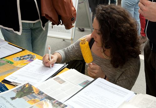 二零一三年九月十三日和十四日,法轮功学员连续两天参加了慕尼黑街头艺术节,揭露中共活体摘取法轮功学员器官的血腥迫害。人们老远就看到醒目的大标语:“中共政府参与器官活摘”,他们纷纷驻足观看真相展板和索取真相资料。不少人看到横幅后,径直走到展台前要求签名,制止中共恶行。一些市民签完名之后,还向法轮功学员道谢,感谢他们的勇气和艰苦付出。  了解真相的人们纷纷签名制止中共活摘器官。 |