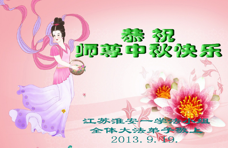 江苏省连云港市大法弟子携母亲及女儿恭祝慈悲伟大的师尊中秋节快乐,弟子将按照师父的要求继续做好三件事,尽自己最大的力量多救人。 2013年9月10日 江苏省南京溧水区全体大法弟子恭祝师尊中秋快乐!感恩师父和大法!