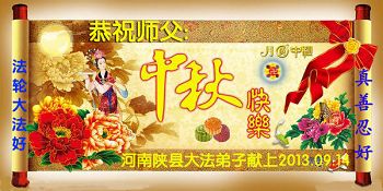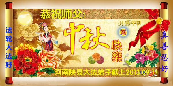 又是一年中秋到,每逢佳节倍思亲。师父,您好!中原大地的大法弟子们想念您! 师父,您为救度众生付出了一切,弟子做的还很不够,感到很惭愧。我们做弟子的只有精進、再精進,努力用心做好“三件事”,才能配得上大法弟子的称号,用正念正行来汇报师父的慈悲救度之恩! 河南漯河大法弟子合十叩拜 2013年9月15日 河南漯河市一老年学法组恭祝伟大师父中秋快乐!