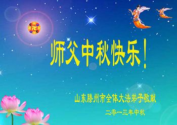 慈悲伟大的师父: 中秋节好!师父您辛苦了!弟子们想念师父! 在正法最后的时刻,弟子们一定要做好该做好的三件事,圆容师父所要的,让师父多一些欣慰。决不辜负师父的慈悲救度!完成我们的史前大愿!圆满随师还! 山东烟台芝罘区全体大法弟子敬上 二零一三年九月十四日 河北省衡水市深州市一学法小组大法弟子祝师父中秋节愉快!