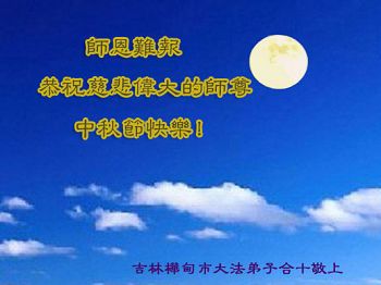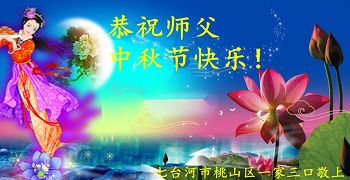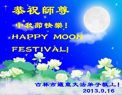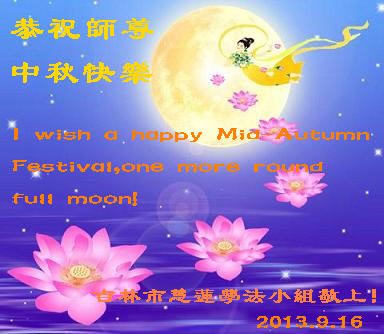 敬祝慈悲伟大的师尊中秋节快乐!师尊您辛苦了! 我们一定要以法为师,精進实修,做好三件事,时时向内修、向内找,走好最后的路,跟师尊回家!请师尊放心。 中国大陆大庆让胡路区大法弟子敬上 二零一三年九月十六日 山东济宁大法弟子恭祝师尊中秋快乐!