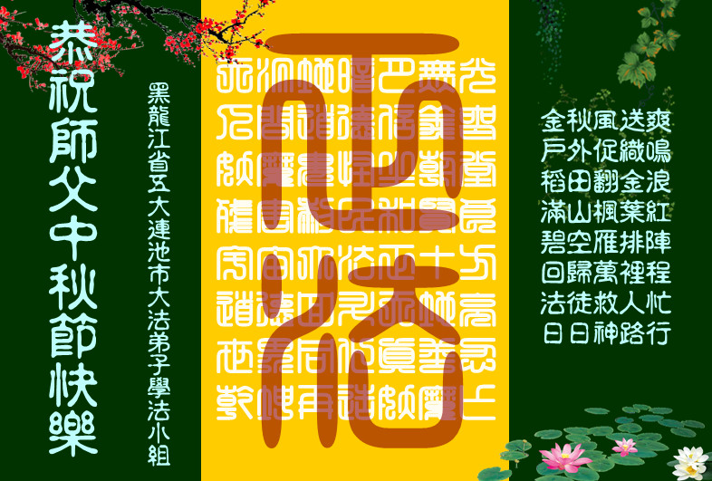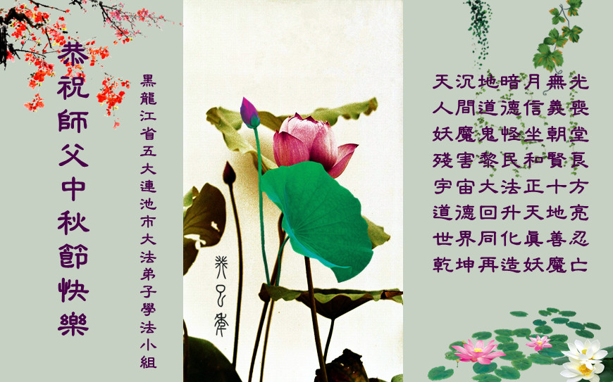 在中秋节到来之际,大陆一学法小组,恭贺慈悲伟大的师父节日快乐!请师父放心,我们一定听师父的话,做好三件事。 辽宁省大连大法弟子恭贺伟大师尊李洪志老师癸巳年中秋快乐!