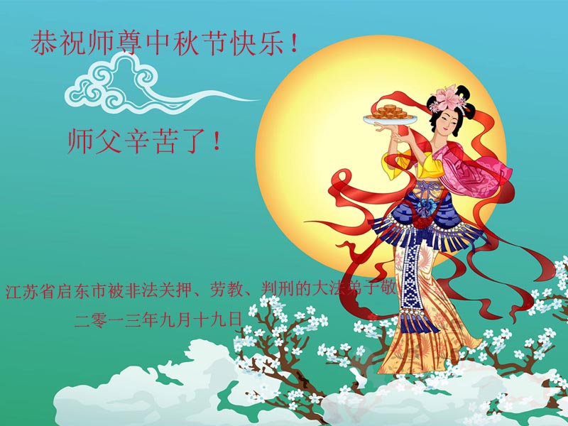 又是一年中秋节,很是想念师父!师父啊!是您替弟子化解魔难,是您加持弟子正念,是您对弟子的呵护才有了弟子的今天。弟子做的不足让师父操心了。愿做师父的真修弟子,听师父的话,跟师父回家!谢谢师父的慈悲救度!弟子叩拜师父! 我代表被非法关押在山东省女子监狱的所有大法弟子向伟大慈悲的师尊致以节日的问候!祝师尊中秋愉快!