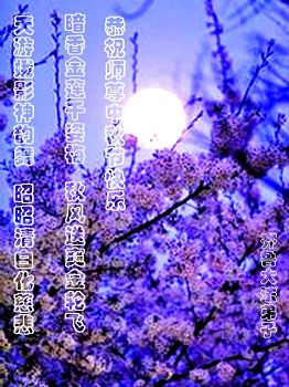 千姿梅暗香金莲千姿梅, 秋风送爽法轮飞, 天游娥影神韵舞, 昭昭清白化慈悲。 大陆大法弟子 晓程 河南巩义大法弟子恭祝师尊中秋节快乐!