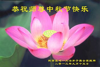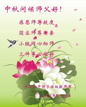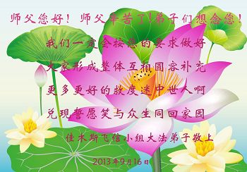 敬爱的师父好! 中秋节好!每逢佳节倍思亲,特别想念可亲可敬的师父。 我是九四年亲自听师父来大连传功讲法的亲传弟子,十几年来心中总想着师父,信师信法。按师父的法严格要求自己,修心性,做大法弟子应该做的救人的事,助师正法救度众生。但是,我做的很差,与修炼好的弟子比更是差距很大,真是愧对师父的教导。我今后一定要努力,严格要求自己,做真修弟子跟师父回家。 再一次恭祝慈悲伟大的师父中秋佳节快乐! 想念师父的:大连大法弟子叩拜 2013年9月17日星期二 黑龙江省佳木斯中部学法组大法弟子中秋问候师父好!