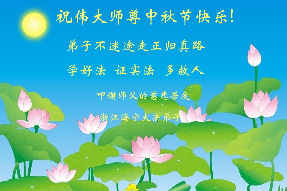 弟子不迷途走正归真路 学好法 证实法 多救人 叩谢师父的慈悲救度 浙江海宁大法弟子 2013年9月16日 大陆三大法弟子恭贺师父中秋节快乐!