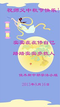 感恩师救度 用心多救人 佳木斯大法弟子近江中老年学法组敬上 2013年9月16日 黑龙江省佳木斯大法弟子恭祝伟大师尊中秋快乐!
