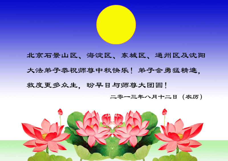 北京西城阜外大法弟子敬上 北京石景山区、海淀区、东城区、通州区及沈阳大法弟子恭祝师尊中秋快乐!