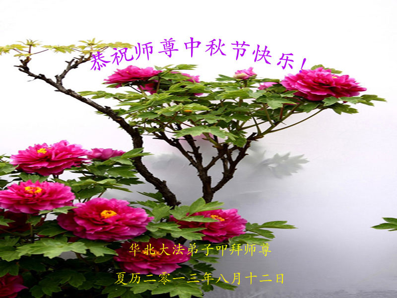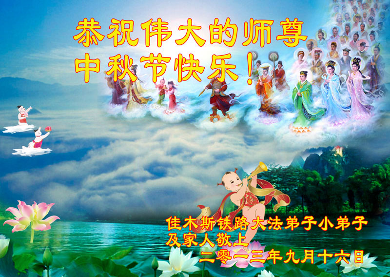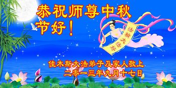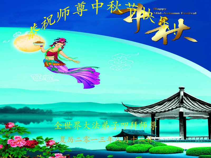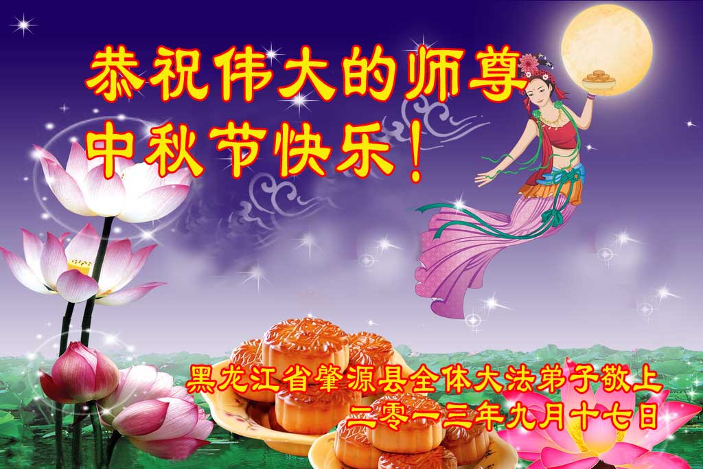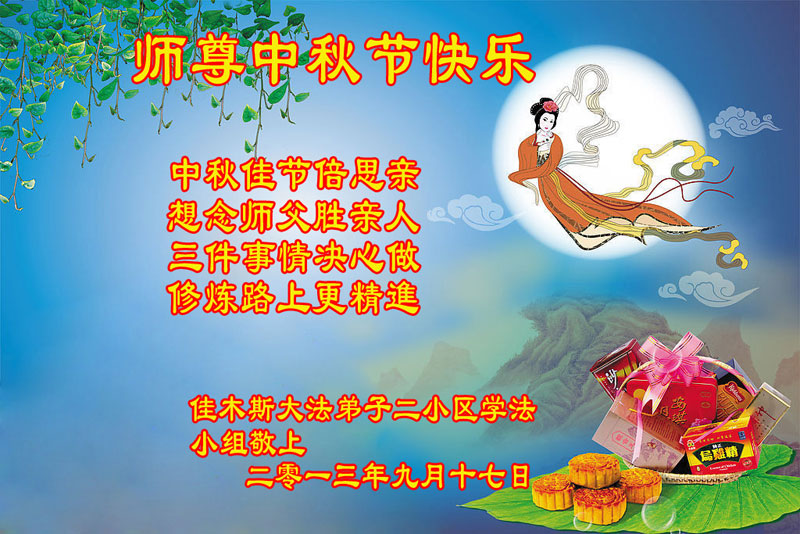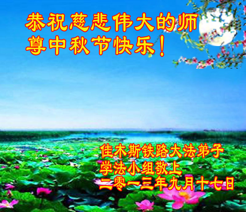 【明慧网二零一三年九月十九日】 大陆东极一小镇全体大法弟子跪拜恭祝师尊中秋节快乐!弟子们以精進谢师恩!