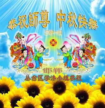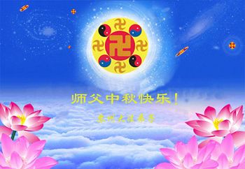 慈悲伟大的师尊您好!您辛苦了!值此一年一度的中秋佳节之际,仰观空中皓洁的明月,遥望大洋彼岸,倍加思念慈悲伟大的师尊。弟子们一定遵循师尊的谆谆教诲《越最后越精進》,认真踏实的做好“三件事 ”,坚定实修,兑现史前大愿,随师尊回归美好的家院。请师尊放心,我们已经找到了不足之处,以后要加倍努力,城乡协调一致,学好法,做好三件事,邪恶灭尽,助师正法到最后,和师尊一块回家团圆。 江苏省盐城大法弟子恭贺慈悲伟大的师尊中秋节快乐!