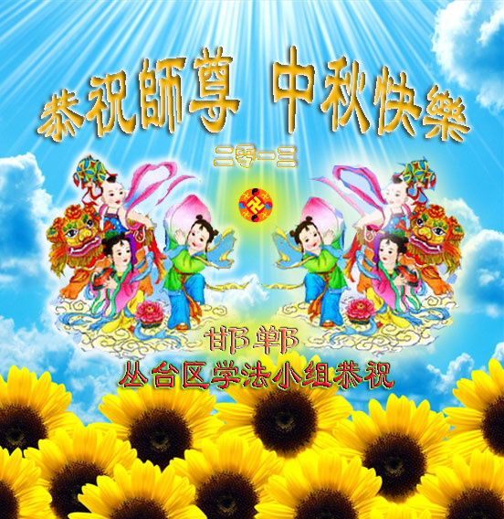 每逢佳节倍思师父, 值农历2013年8月15中秋佳节来临之际, 盐城大法弟子向伟大的师父问好!愿慈悲伟大的师尊节日快乐!在正法的最后一点时间里,我们会严格按大法要求, 做好该做的三件事。请师尊放心。 江苏省无锡市一大法弟子率全家恭祝慈悲伟大的师尊中秋节愉快!
