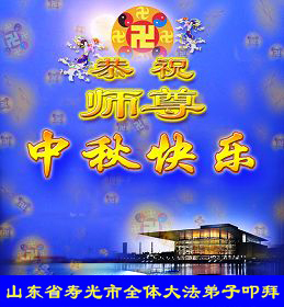 佳节又来到 师尊问候亲 正法已收尾 寰宇一片新 我在世间行 助师把法正 清除烂鬼不法神 救度一切众生 师父真慈悲 誓把众生救 不法神干扰 红魔邪烂鬼 他日清除尽 众生感师恩 山东省潍坊市临朐县全体大法弟子恭祝师尊中秋节快乐!