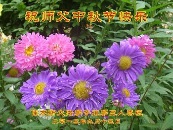 同修三姐妹, 七十以上岁。 修炼十多年, 正法路上追。 集体学大法, 聪明有智慧。 真相讲明白, 救人劝三:退.。 晚年很幸福, 幸福师尊给。 叩首谢师尊, 师赐福人类。 内蒙古通辽市全体大法弟子恭祝师尊中秋佳节快乐!