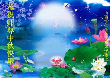 请师尊放心;众弟子一定谨记师训,学法精進不懈,时刻同化大法,遇事向内找,做好三件事,多救人,助师世间行。衷心祝愿慈悲的师尊早日回国与众弟子团聚! 山西省朔州市怀仁县全体大法弟子恭祝师尊中秋节好!