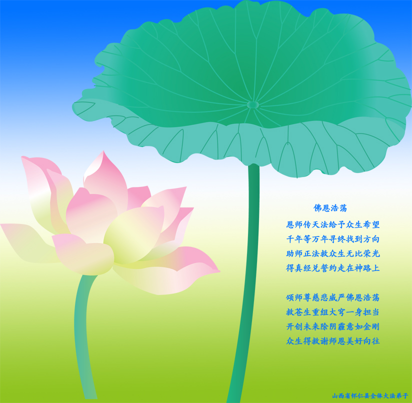 山西省朔州市怀仁县全体大法弟子向慈悲伟大的师尊问好: 师尊中秋节好!师尊您辛苦了!您为弟子及众生付出了巨大的承受,每想到这弟子泪流不止。弟子期盼恩师早日回归,希望师尊多一份欣慰,少一份操劳。 佛恩浩荡 恩师传天法给予众生希望 千年等万年寻终找到方向 助师正法救众生无比荣光 得真经兑誓约走在神路上 颂师尊慈悲威严佛恩浩荡 救苍生重组大穹一身担当 开创未来除阴霾意如金刚 众生得救谢师恩美好向往