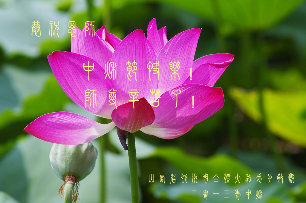 万朵净莲栽, 亭亭玉立开。 淤泥掩不住, 出水好姿态。 山西省太原大法弟子恭祝师尊中秋节快乐!