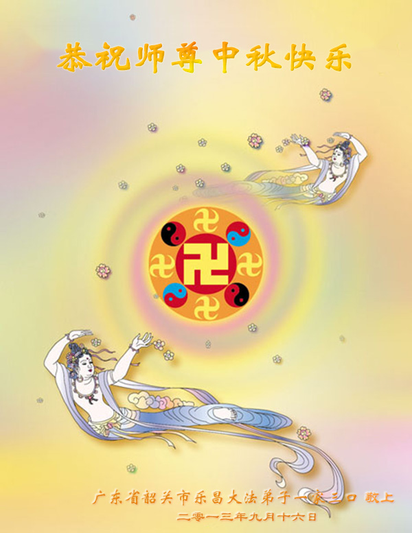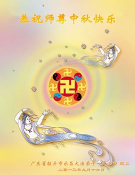 祝师父节日快乐! 中秋节到了,我们学法小组全体学员及我们全家向师父汇报师恩。祝师父中秋节快乐! 山东烟台(招远)一学法组学员 二零一三年九月十三日 广东省韶关市乐昌大法弟子一家三口恭祝师尊中秋快乐!