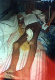 二零零二年九月二十九日晚五点钟左右,黑龙江哈尔滨市南岗分局五、六个恶警闯入周景森家中进行抄家,在没有任何法律程序的情况下将他家三人(其中有他老伴和他的女儿,都是修炼人)强行带走,非法判每人三年劳教,周景森被关押哈尔滨长林子劳教所四大队。哈尔滨长林子劳教所恶警指使犯人对周景森实施暴刑“转化”,用六根电棍同时电。后来周景森浑身长疥,上始脖子,下至脚脖,全身布满疥,身体日渐消瘦,成了皮包骨了,连坐都坐立不住。四队教导员杨宇看他实在坐不住,就把他弄到楼上房间里躺着,也不放周景森回家。直到躺了一个多月,赶上处里来检查,发现了卧床不起的周景森,说怕担责任,于二零零三年八月二十一日长林子劳教所通知把人接走。八月二十五日亲朋把他送医院,大夫检查时发现此时周景森整个身体皮肤的颜色都是深褐色的,皮包骨头,一位矍铄的老教授被劳教所迫害成了这个样子:  周景森被劳教所迫害成这个样子 |  家人在照顾周景森 |