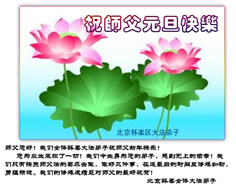 尊敬的师父:我们连亲戚一大家子有近十口人是师父的弟子,这么多年来,我们在大法中受益无数,我们对师尊的感恩无以言表!我们一定会按照师父指给我们的路走下去,认真做好三件事,一定不辜负师父的辛苦度化,请师父放心! 北京丰台海淀大法弟子恭祝师父新年快乐!