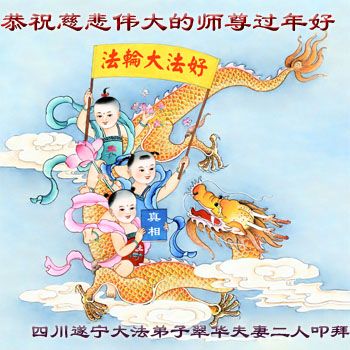 我们老夫妻二人能有幸双双得法,成为正法时期的大法弟子,这是慈悲伟大的师尊对我们的慈悲救度。 历史又要走入新的一年了,弟子用任何语言也无法表达对最伟大师尊的感恩之心,恭祝师尊新年快乐!在接下来的一年中,一定勇猛精進,做好三件事,圆满随师还。跪拜师尊! 四川遂宁老年夫妻大法弟子叩拜 2014.1.11 四川遂宁大法弟子翠华夫妻二人恭祝师尊新年快乐!