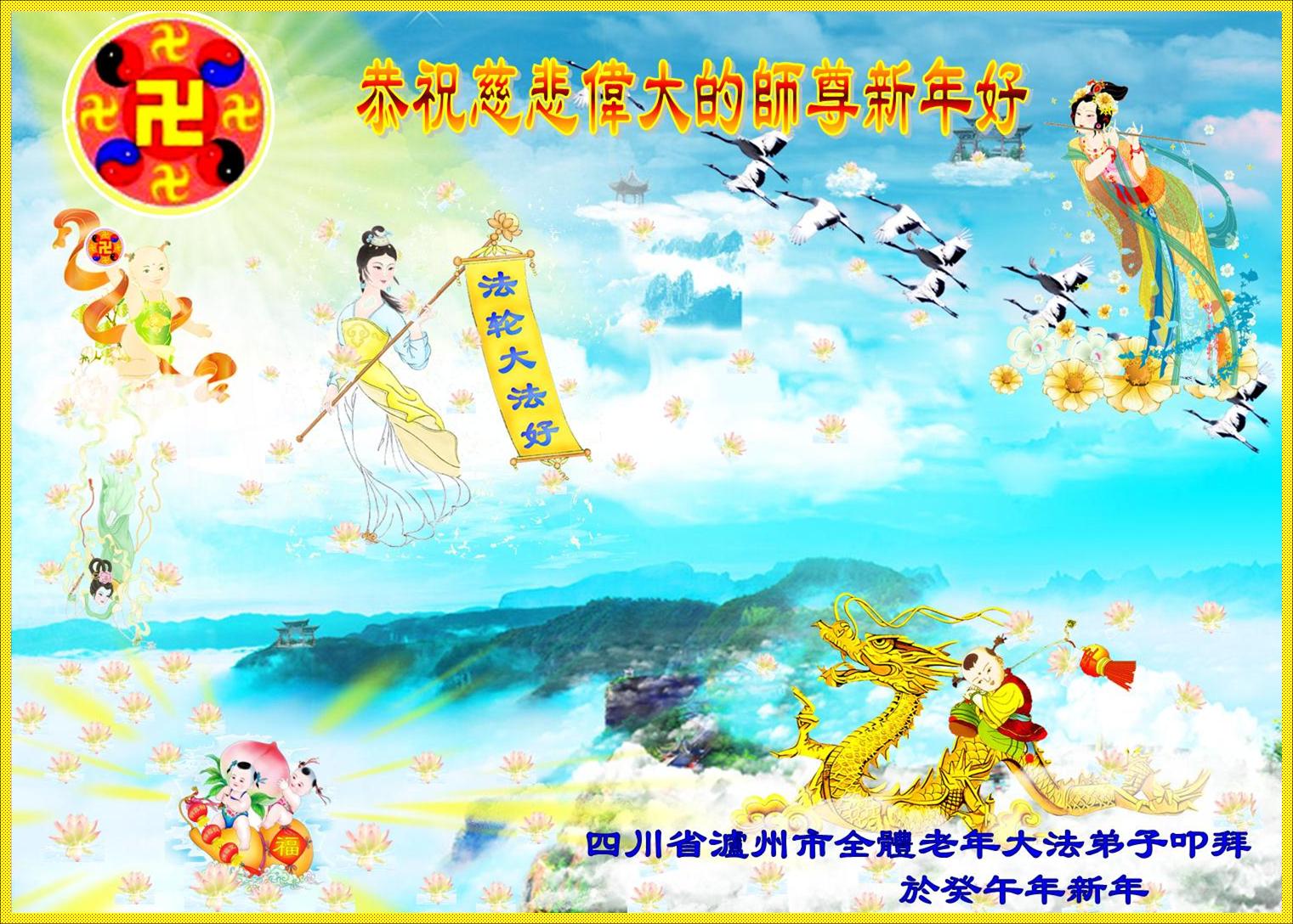 在辞旧迎新即将来临的时刻,全体大法弟子齐聚共同祝愿慈悲伟大的师父新年快乐!伟大的师父为弟子艰辛付出和操劳又一年,弟子在此感恩师父,但千言万语也难以表达弟子对师父的思念和感恩。师恩无以回报,我们只有在新的一年里抓紧时间做好三件事,按照师父的要求,肩负使命,不折不扣的去兑现自己的誓言,共同配合,携手并進走在证实大法的道路上。 四川省泸州市全体老年大法弟子恭祝师尊新年好!