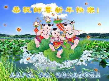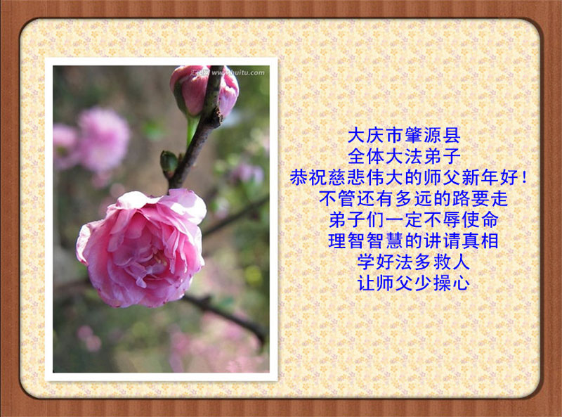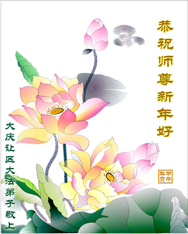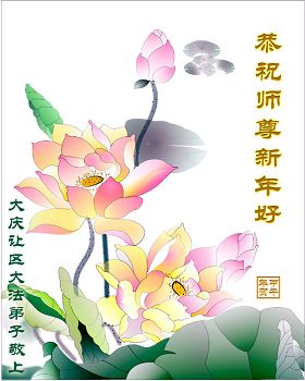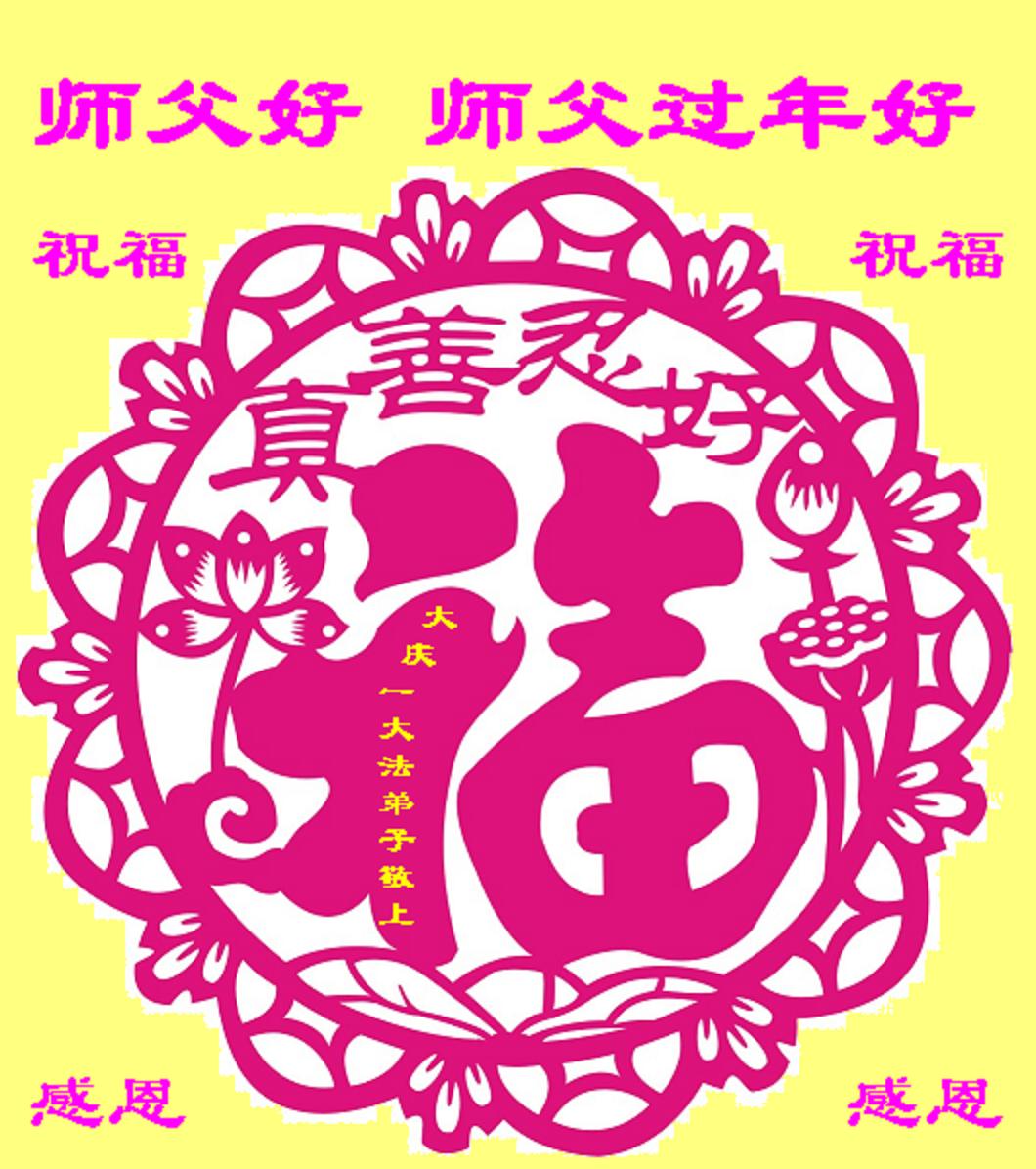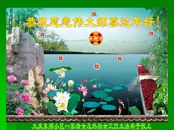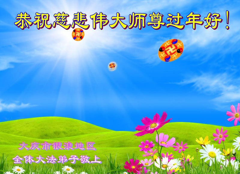 人身难得我有,万古机缘我遇,正法难求我得,大法洪传我在世。经历了近十五年的腥风血雨,弟子们在伟大的师尊引领下,从邪恶的迫害中坚定的走向成熟,师尊为弟子们的圆满回归承受的真是太多太多。在正法進程走到最后的宝贵时间里,弟子们一定要做好做正师尊要求的三件事,救度更多的众生,回报师恩。感谢师尊的佛恩浩荡!感谢师尊的慈悲救度! 黑龙江省大庆银浪地区全体大法弟子恭祝慈悲伟大的师尊过年好!