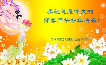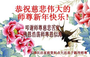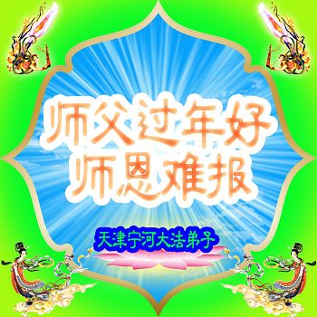 师父过年好! 每逢这个时候,弟子们都万分想念师父!双手合十跪在您的法像前,感念师父的恩德,一幕幕往事涌上心头,泪水涌动。为了祛病,弟子走到了师尊的身旁,从那一刻起,您就无时无刻的关心呵护着弟子。邪恶疯狂的时候,不争气的弟子迷茫糊涂,被邪恶操控做出了给您和大法抹黑的事,师父痛心,也是弟子永远的耻辱…… 醒悟了,弟子终于又走回来了,在最后关头,弟子会加倍弥补过失,洗刷污点,谨记师尊教诲,溶于法中,做好三件事,让师父少操一点心! 师父,弟子给您磕头了!弟子盼望着师尊早日回归中土,与师尊欢聚! 天津全体大法弟子恭祝师父过年好!