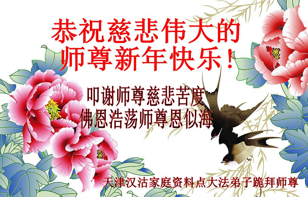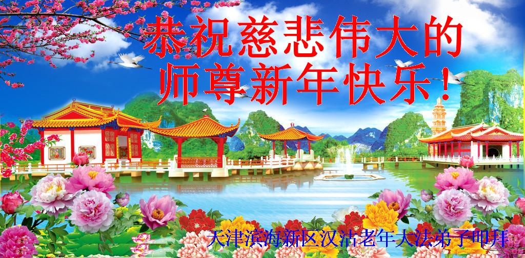 祝师父新年快乐!弟子们替得救的众生谢谢师父的慈悲救度,在新的一年里弟子们会继续做好三件事,救度更多的众生,愿师父早日回到大陆,弟子们想念您。 天津河东区向阳楼大法弟子恭祝师父过年好!