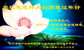 师父您好!弟子们给您拜年了!衷心说一声:师父您辛苦了!弟子们唯有精進实修以报师恩。谨以一首小诗表达我们的心声: 严寒逝,春将至,心中牢记三件事; 明法理,众心齐,法中归正路清晰; 善念起,金刚志,感恩得度万般喜; 救人急,不知疲,助师正法航不迷。 辽宁省葫芦岛绥中大法弟子恭祝师父新年快乐!