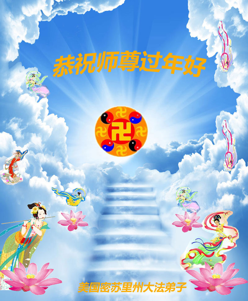 沙加缅度大法弟子给慈悲伟大的师尊拜年!新的一年里,弟子们会加强自身修炼,更好的相互配合,认认真真的做好三件事,紧跟师父的正法進程,完成我们的历史使命,以谢师恩。 美国密苏里州大法弟子恭祝师尊过年好!