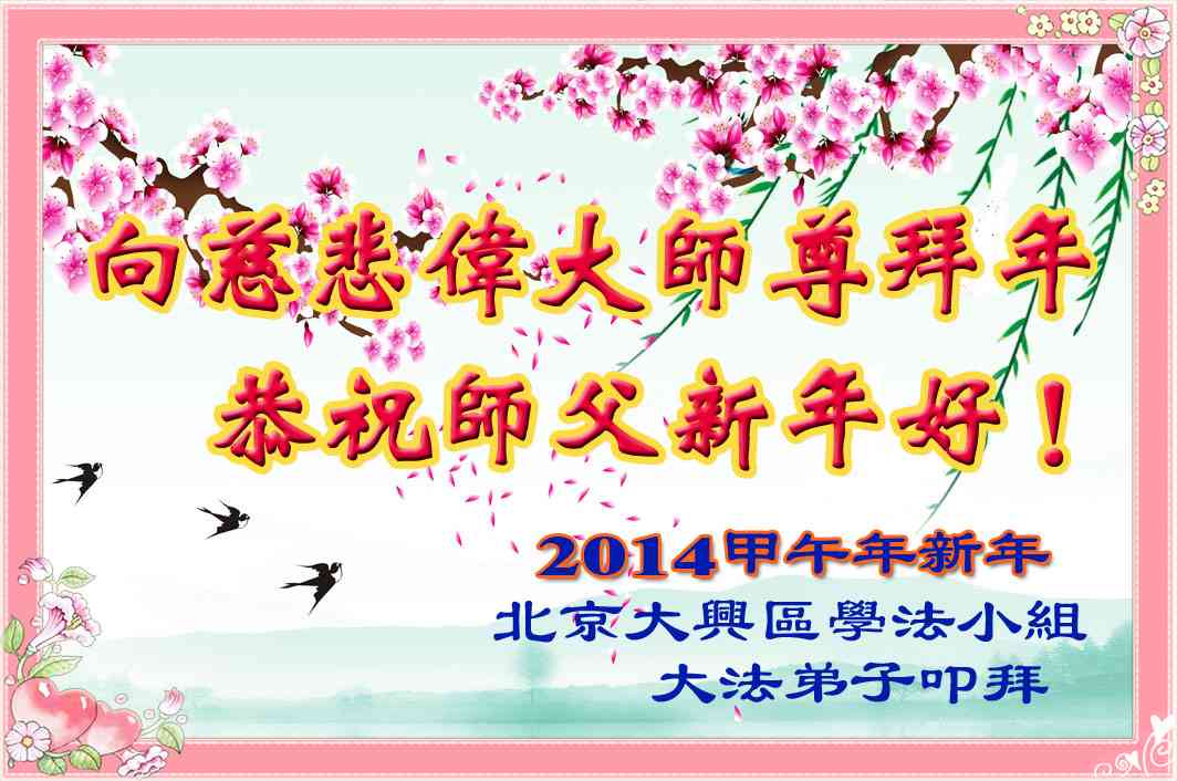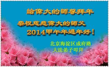 2014甲午年新年,北京大兴区学法小组大法弟子,向慈悲伟大师尊致以最崇高的敬意!恭祝慈悲伟大的师父2014甲午年新年好!师父过年好!师父您辛苦了!弟子感恩伟大师尊的慈悲救度,我们要更加精進,做好三件事,让更多世人了解真相,得救度。 北京海淀区成府路大法弟子恭祝慈悲伟大的师父2014甲午年新年好!